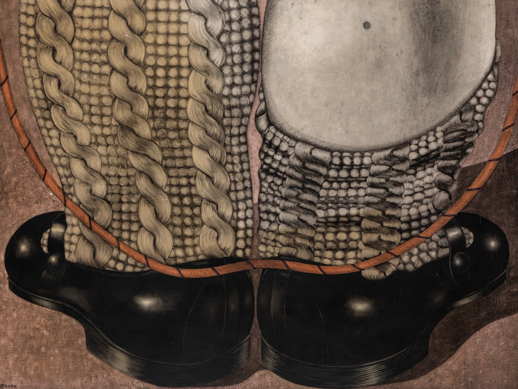 Le titre évocateur “Le Rendez-vous” annoté au dos de la toile de 1972 que nous présentons n’est pas sans allusion. Il nous offre des clés de lecture face à ce que nous devinons être un béret masculin rose pâle et une dentelle féminine bleue nuit suspendus l’un sur l’autre à un porte-manteau noir.